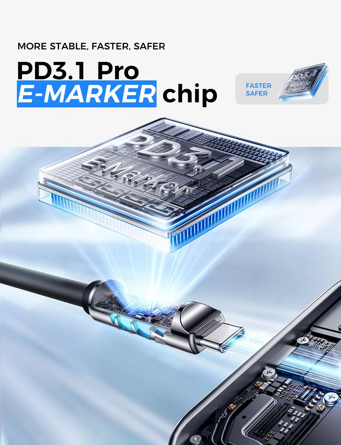 Built-in E-Marker 3.1 chips provide intelligent safeguards against overcharging, overheating, and short circuits. Auto power cut-off at 100% helps protect battery health, ensuring safe and stable charging.