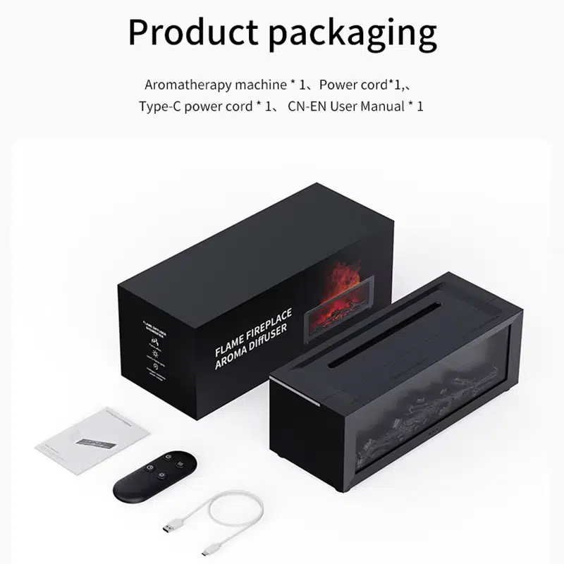 Function: Aroma oil atomization, no water intelligent shutdown, colorful ambient lighting & realistic fireplace night light,Self-contained remote control