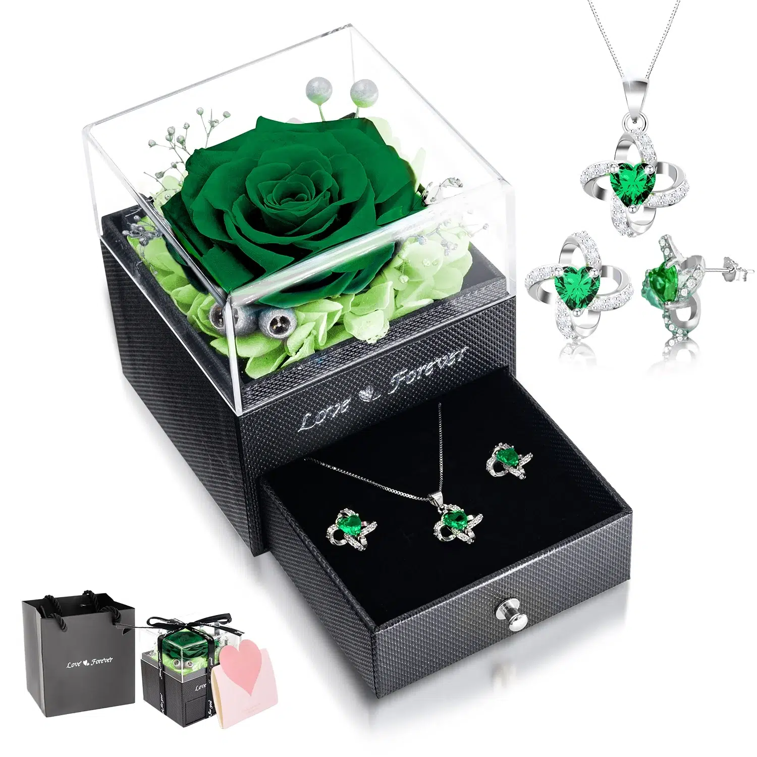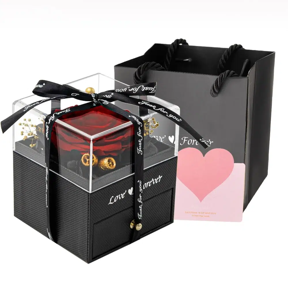 ใExquisite 7-in-1 Gift Setใ 1 Preserved Eternal Rose + 1 Jewelry Box + 1 Necklace + 1 Pair of Earrings + 1 Gift Bag + 1 Greeting Card + 1 Ribbon. Sending preserved flowers on important days is not a simple gift, it is more like a solemn promise. Whether it is guarding love, guarding family, or guarding friendship, you can always find the one to guard and put it in the most important place in your heart, so that love, family, and friendship will last forever.