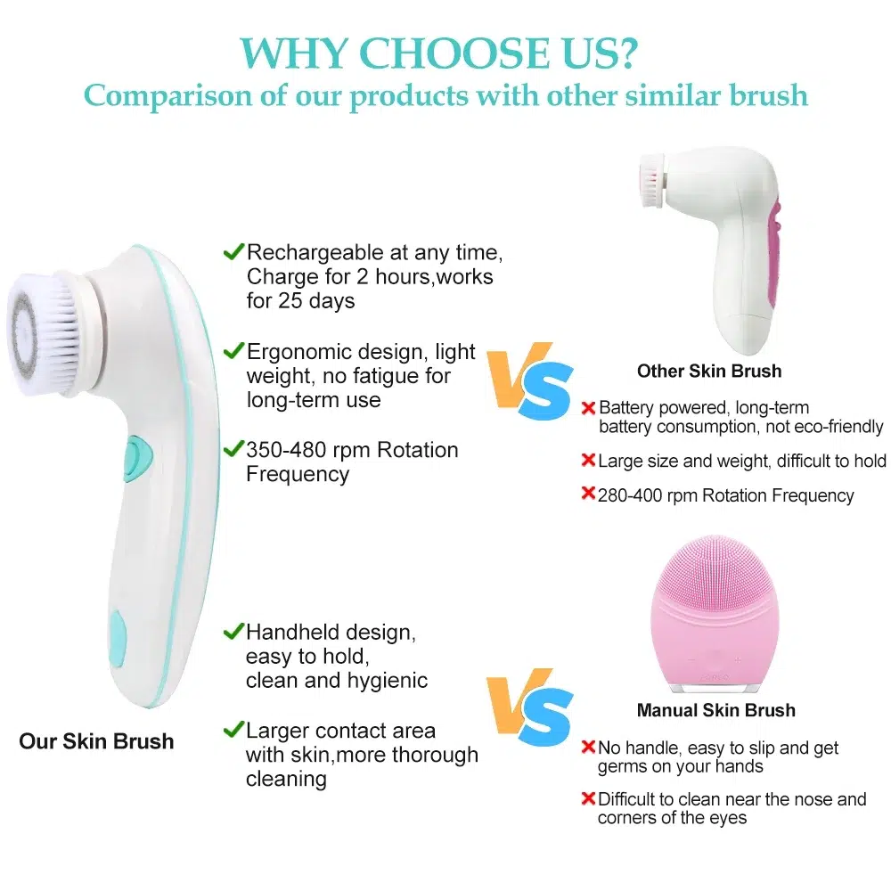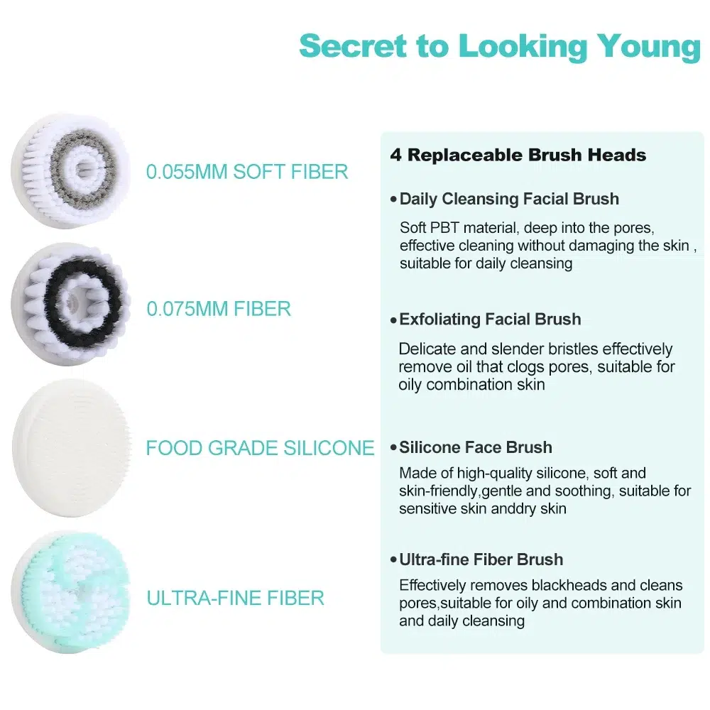 - Our electric face cleansing brush set help you with 360 degree rotating deep cleansing and gentle exfoliating. It comes with 4 kind of replacement brush heads – one silicone brush head is food grade, no any hurting for skin,it’s gentle and soothing,suitable for sensitive skin, one daily cleansing facial brush head with 0.055mm soft fiber, is suitable for all skin types, includes oily/combination/normal skin, one exfoliating brush head with 0.075mm fiber is suitable for oily combination skin and deep cleansing, one ultra-fine brush head is suitable for daily cleansing.
