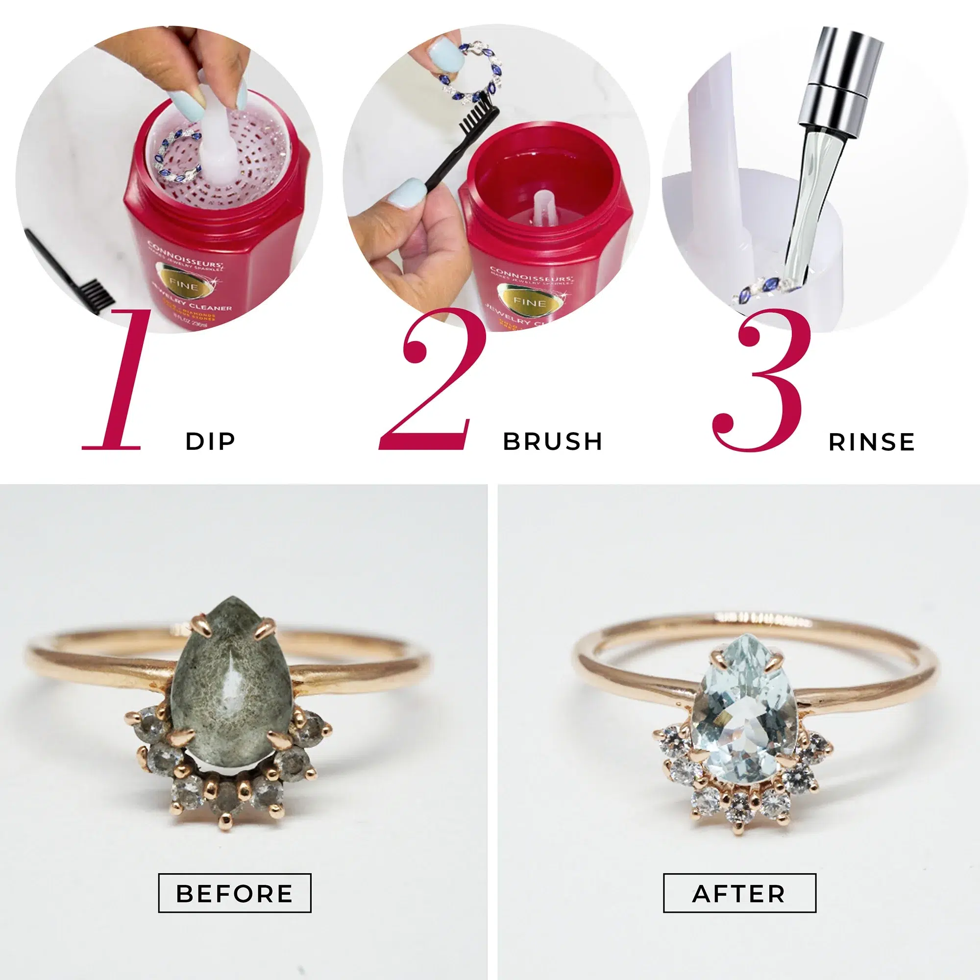 • Explore Connoisseurs Silver Jewelry Cleaner for sterling silver and Delicate Jewelry Cleaner for semi-precious stones, pearls, and fashion jewelry