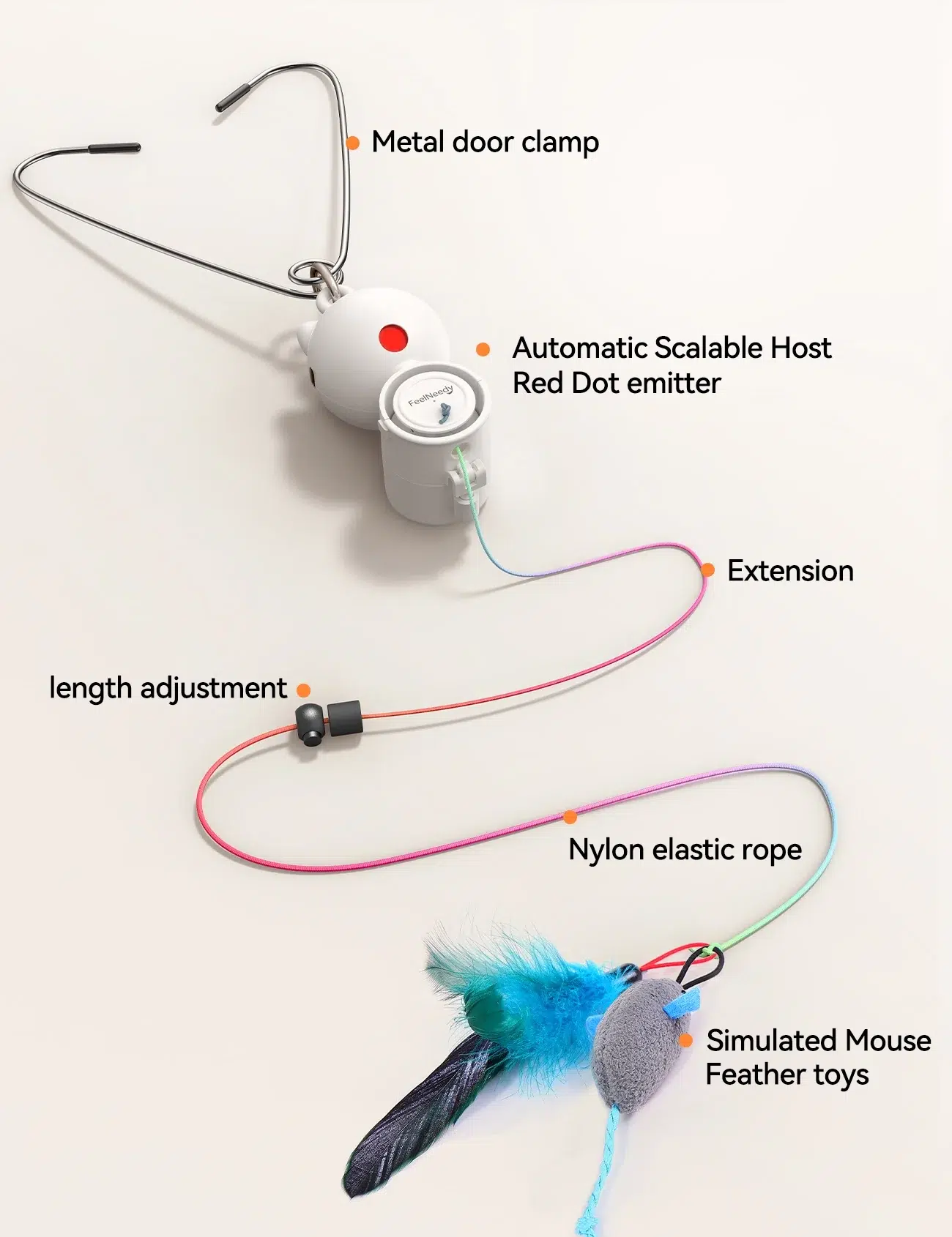 - Easy to Install and Use: Only need to attach the feather/mouse accessories to the elastic rope and then hang it over the door. No tools needed. The adjustable clamps of the toy can fit most of the door frames (maximum width: 9.8 inch). Simply start and select modes with single button.