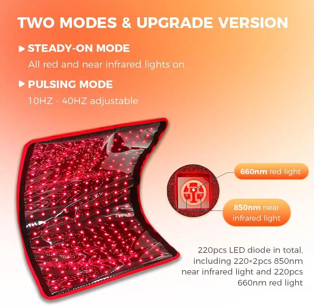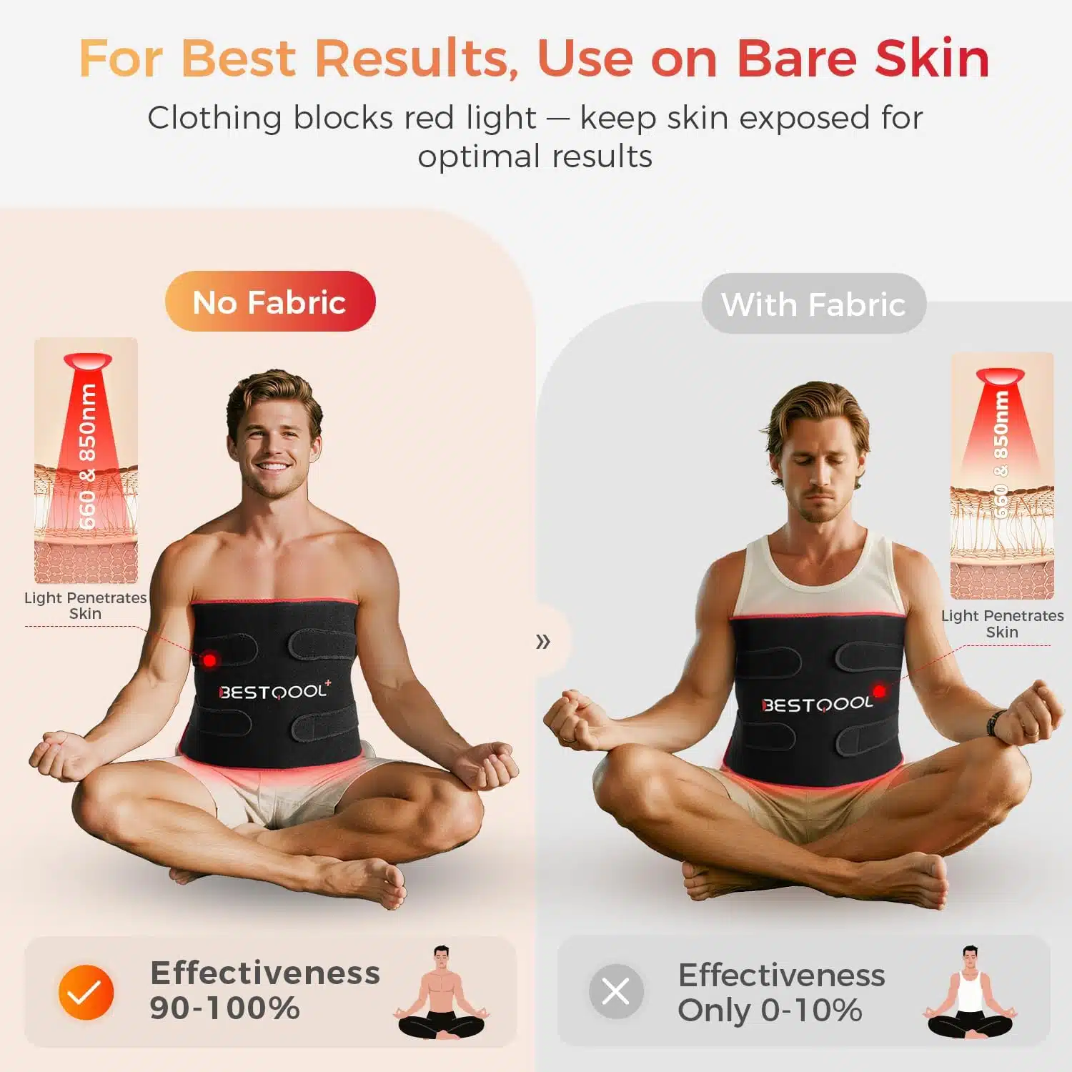 - SEAMLESS FIT RED LIGHT BELT: This red light device provides full-coverage infrared therapy without the need for multiple wraps, maintains the convenience of LED red light pads for use on flat surfaces, emits red light over a large area, and is portable! Utilizing highly efficient clinical tri-chip LED beads, red light therapy sessions are twice as effective compared to other infrared therapy devices.