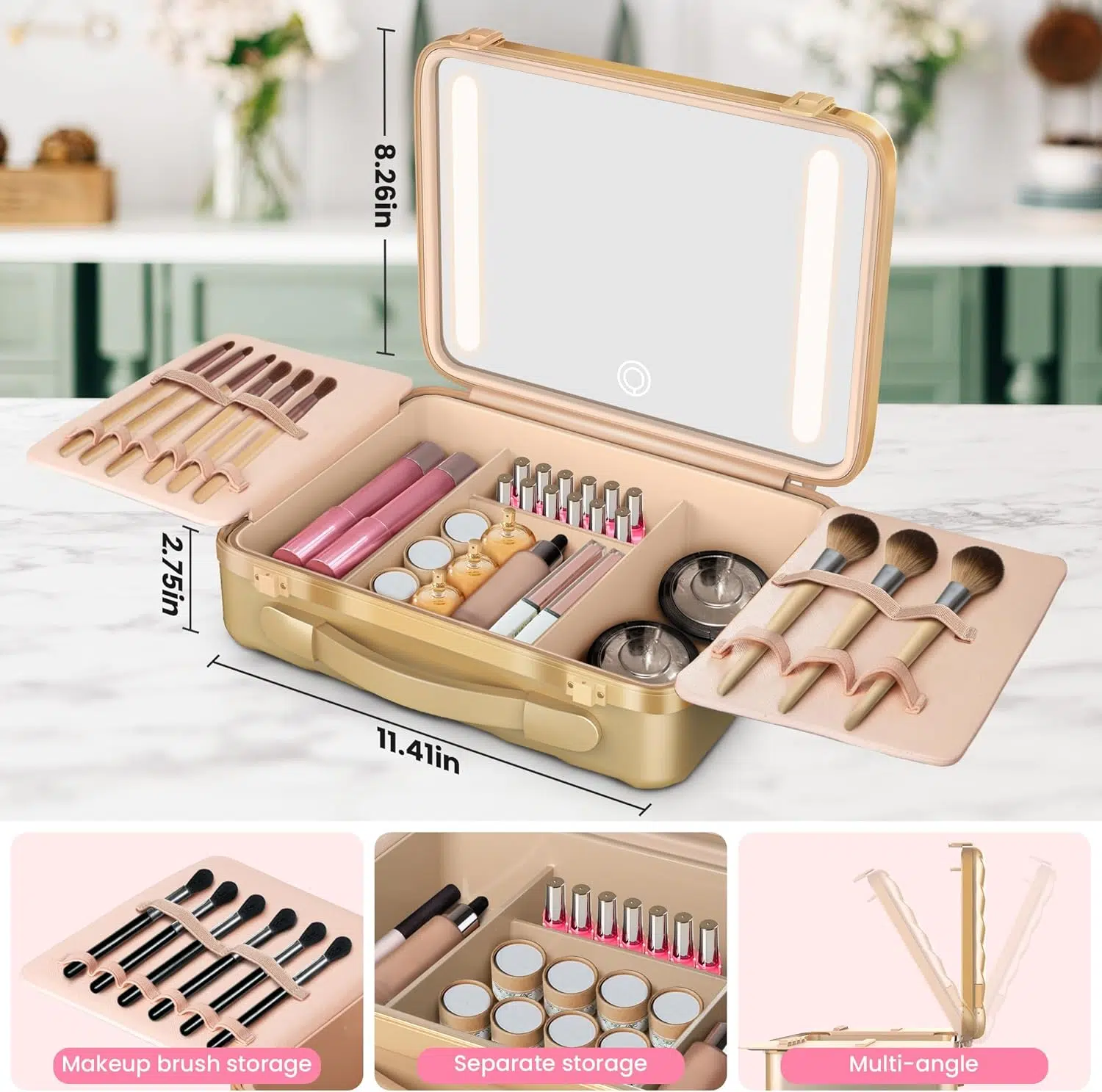 Boasting ample space and a partition board for superior organization, it effortlessly stores all your cosmetic essentials, including messy makeup brushes, with ease. Crafted from durable ABS plastic, it ensures your cosmetics are protected against water, pressure, and everyday wear. Plus, with a rechargeable LED makeup mirror offering three adjustable lighting modes and a sleek design, achieving flawless makeup on-the-go has never been easier.