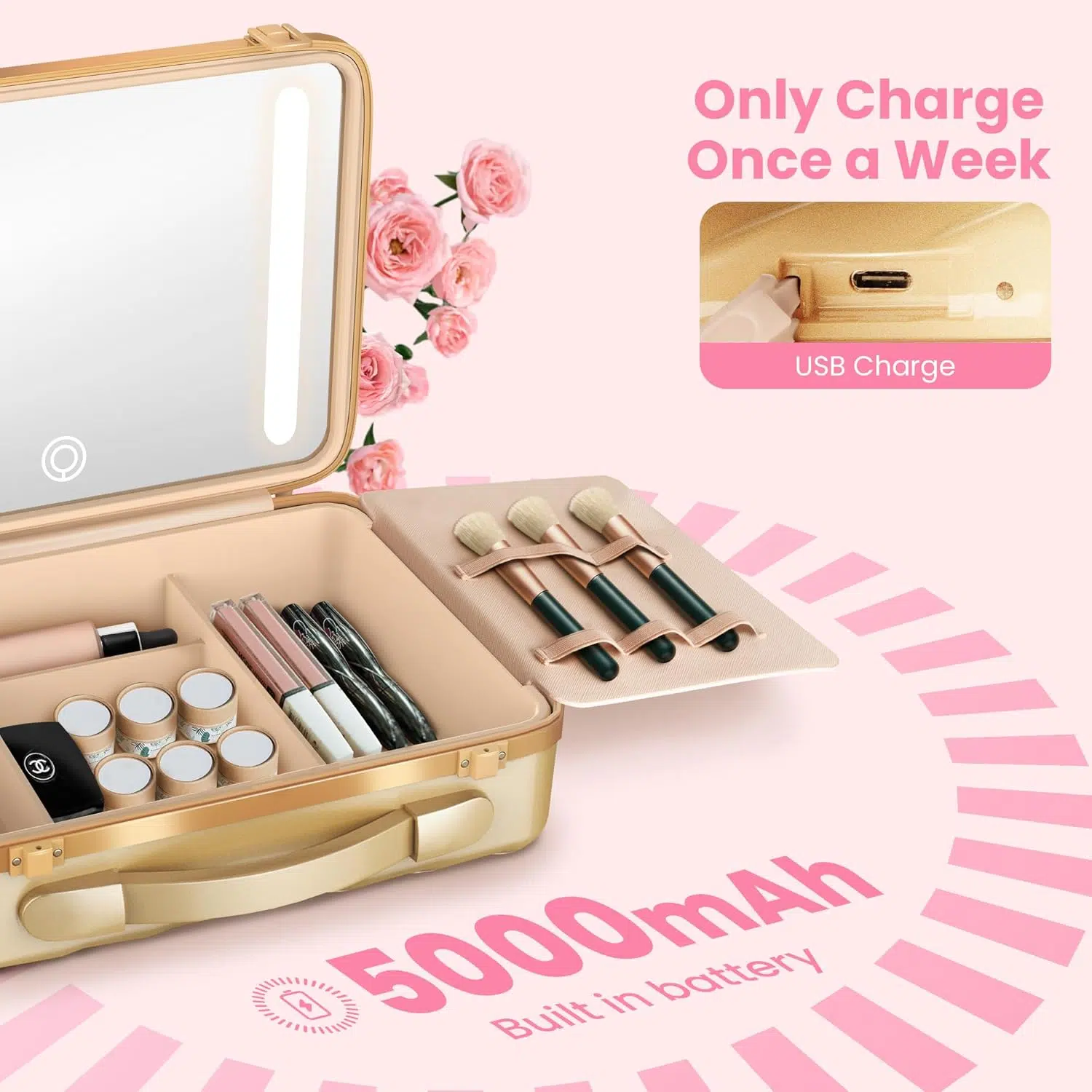 - Perfect for Travel: This lighted makeup case with mirror is your portable dresser with ample storage for essentials. Equipped with a 5000 mAh battery, the mirror lasts up to seven days on a full charge (30 minutes/day), ideal for short trips