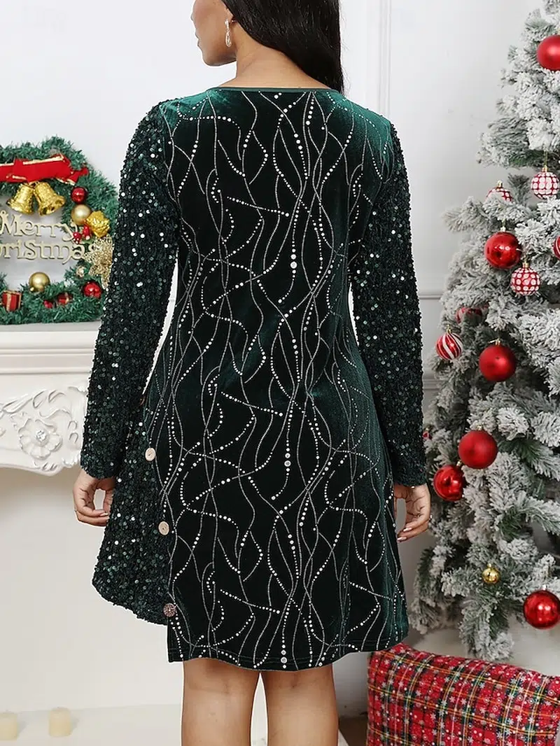 ใFabricใ: Crafted from rich velvet, this dress combines luxurious material with sparkling sequin embellishments for a dazzling effect. The stretchy fabric ensures both comfort and a flattering fit.